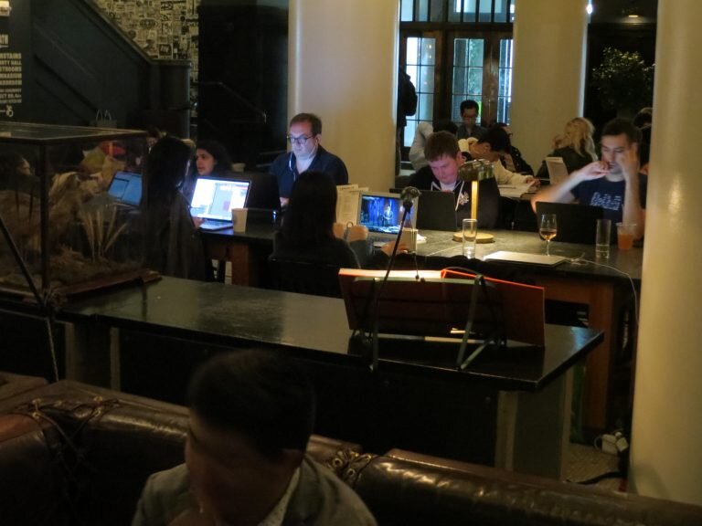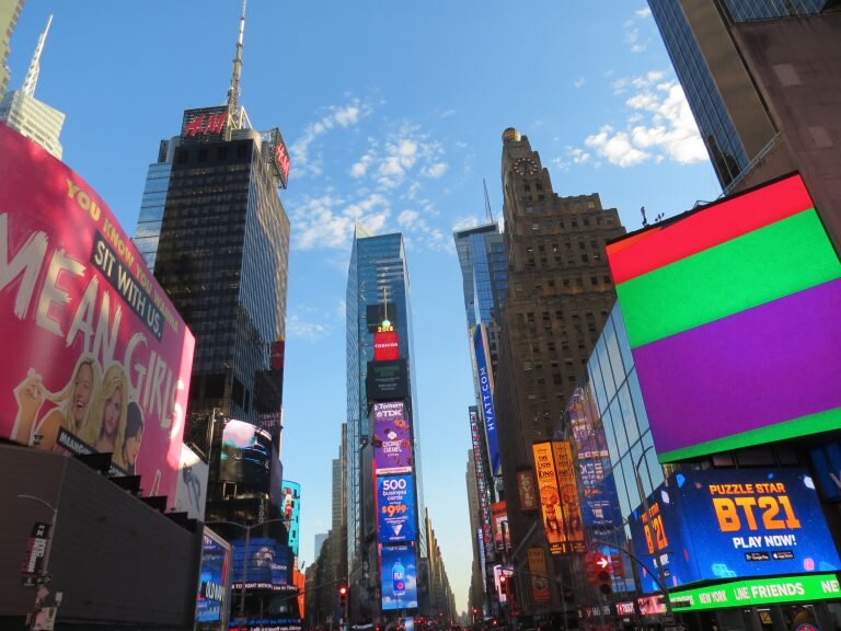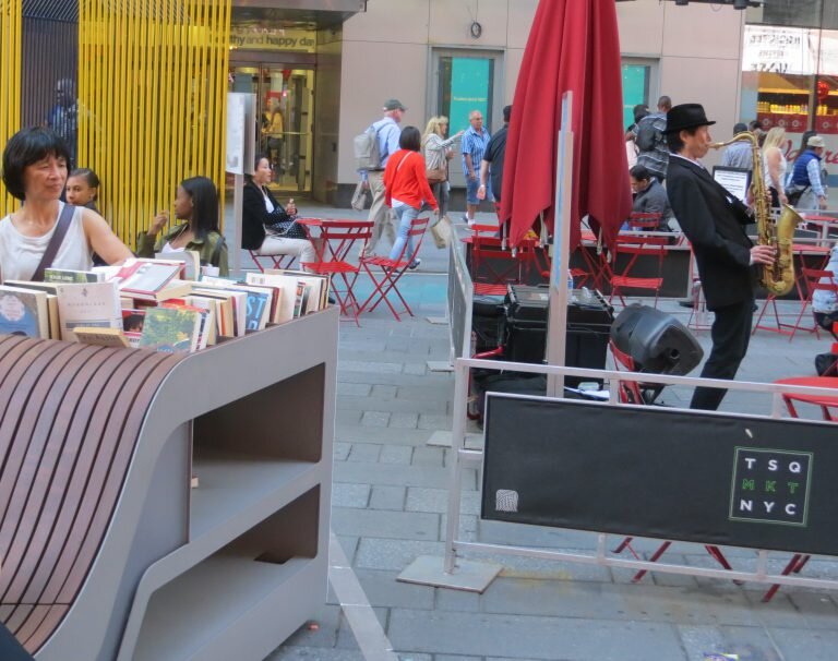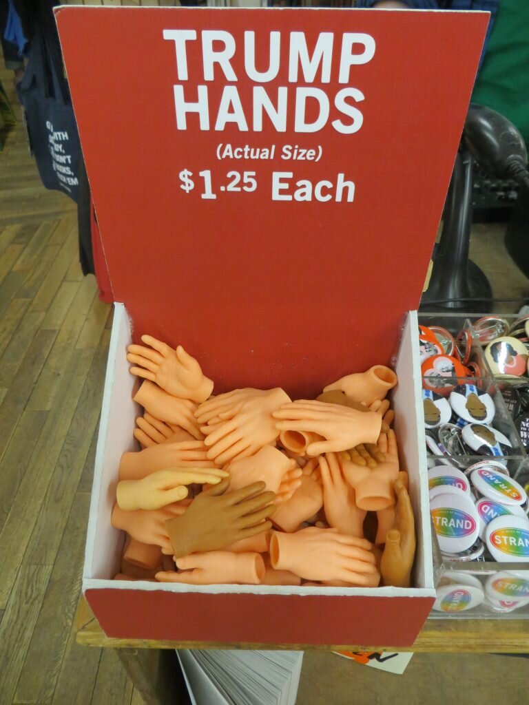 Literary Tourist in New York: The day didn't start off with a bang. Quite the contrary. The early morning meeting I'd set up had been cancelled. I was stranded down at 5th and 14th with several empty hours yawning in front of me. I decided to stroll up 5th Avenue towards Times Square to see what I could see.This was a good startAfter passing a sign of the times,I hit Broadway where I re-encountered Rizzoli Bookstore at it's newish location. It was for years on 57th Street in an elegant six story townhouse, here it continues to specialize in illustrated books on architecture, interior design, fashion, photography, cookery, and the fine and applied arts, as well as literature, and foreign language books; the store also carries European magazines and newspapers and a delightful selection of note cards and stationery.Further along Broadway I came across this appealing combination: free books and free musicThis walk along Broadway reminded me of my first visit to NYC back in the eighties with my friends Pat Grew and Ann Stoner. It was late at night. We had the street to ourselves. Starting right at the bottom of Manhattan we walked all the way up to and past The Lincoln Center. It was hot and Ann's shoes were bothering her, so she took them off and went barefoot. You should have seen the colour of the soles of her feet by the time we got to our destination. Soot black they were. No idea how long it took to get them back to normal. Months I'm sure.It began to rain, so I decided to hop on the subway (I'm likin' some of the artthat decorates the walls) with my convenient three-day pass, and check out one of the places where writers must hang out in New York: the lobby of the Ace Hotel at 20W 29th Street, just off Broadway.All the seats in the pit were taken so I pulled up part of a sofa near the bar ordered a beer and nursed it for about an hour as I observed the scene, surfed the Net and jotted down some notes. Pretty well everyone wore ear-buds. The music (techno-ish) was fairly loud. Not sure I'd be able to write much here. But, certainly, there were lots of writer types present, and one definitely needs to get out of the garret now and again.Next stop, further up Broadway at 12th street, was Strand Bookstore - one of the greatest, most iconic stores in the world. Here I searched for Jonathan Galassi's (more on him later) first book of poetry. Had to settle for the second, signed "with best wishes to Debbie." The main floor was packed with people buying books and cool, useful accessories, such as theseTrump Hands, so I escaped up to the Third, where you'll find the rare book room, one of my favourite places in the world. I once pulled an American First of Mordecai Richler's Apprenticeship of Duddy Kravitz out of here for U.S. $40. I like to think that it's worth way more than I paid. The cover is by Leonard Baskin. Some years ago I interviewed current owner Nancy Bass Wyden about the store and secrets to its longevity. Listen hereNext it was back down to The Housing Works, where you'll find lots of used books and a generous-sized cafe.Since it was just around the corner and I'd heard a lot about it, I dropped in to McNally Jackson. Can't say I saw anything out of the ordinary. Perhaps they have a good reading series. Perhaps it's the cool surrounding neighbourhood. Lots of small boutique shops and trendy ethnic restaurants.The weather had cleared, thankfully, and it was time to head over to Times Square.I arrived in time to meet up with my loved ones, and catch the evening bus tour to Brooklyn. What a magnificent view of the Manhattan skyline.For information on planning a trip to New York City, click here.More.Times Square photo by Caroline Liguori