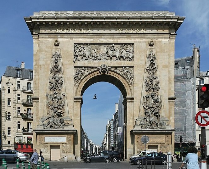 I sat down outside a pleasant enough restaurant - there were potted trees - near the Strasboug-Saint Denis Metro station not far from the Porte Saint-Denis, a massive arch that,