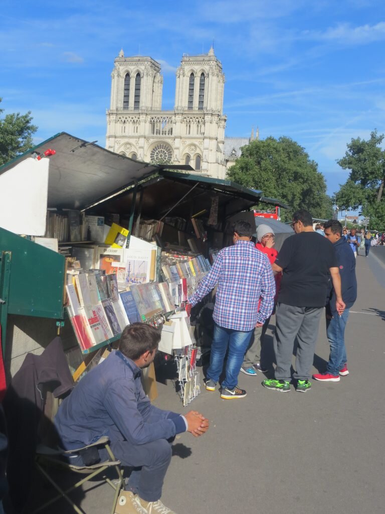 I wasn't alone in admiring it. Over near the river I ran into a couple of bouquinistes plying their trade, just as their namesakes have since the mid-1500s. Apparently the wait time to become one these days is around eight years. But it's not all gravy. If you're not open at least four days a week you lose your spot. Today, bouquinistes’ green boxes - 900 in all - are perched on three kilometres's worth of quayside wall, from the Louvre along past Notre-Dame. It took a while to maneuvre me, the booksellers, and the cathedral into position, but eventually I got the shot I wanted
