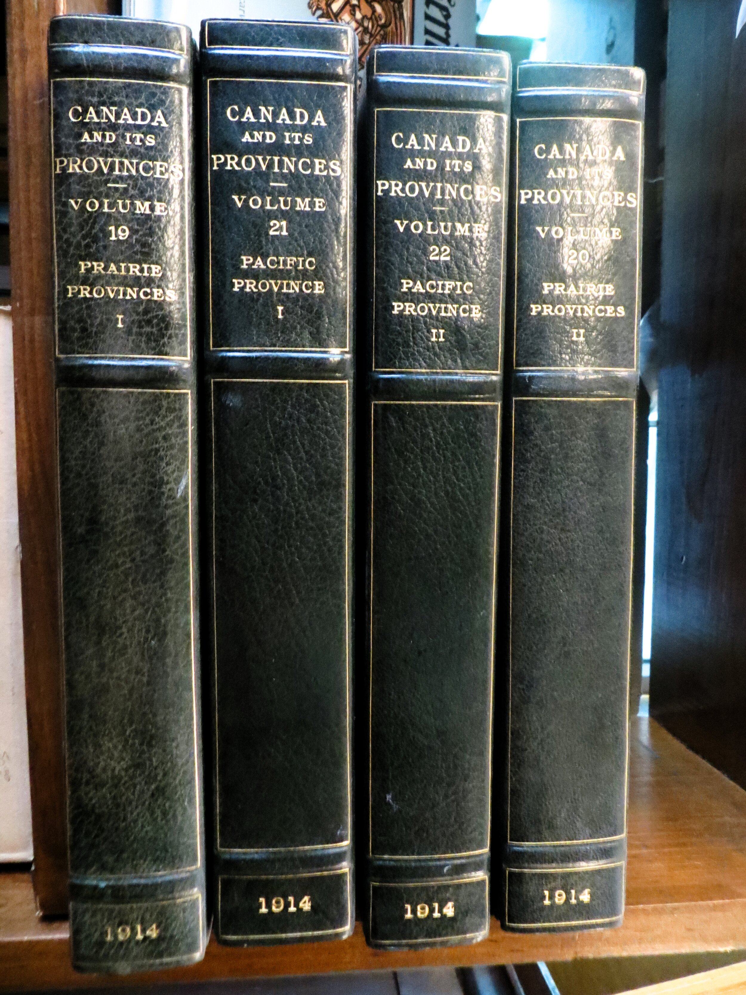 I recently bought this 23-volume set from Liam McGahern in Ottawa, which, by the way, isn’t just any set. There were several published for different markets (education, library, export). This is the full-leather, no-expense-spared Author’s edition. They’re magnificent. Hand-made paper. Lavish illustrations and photographic reproductions. A joy to hold, admire, and yes, read. A monumental achievement. Ian Wilson calls it ‘the trans-continental railway of Canadian culture.’ Glasgow went on to publish a similar set for the United States with Yale University and was in the process of producing a film version when he died.